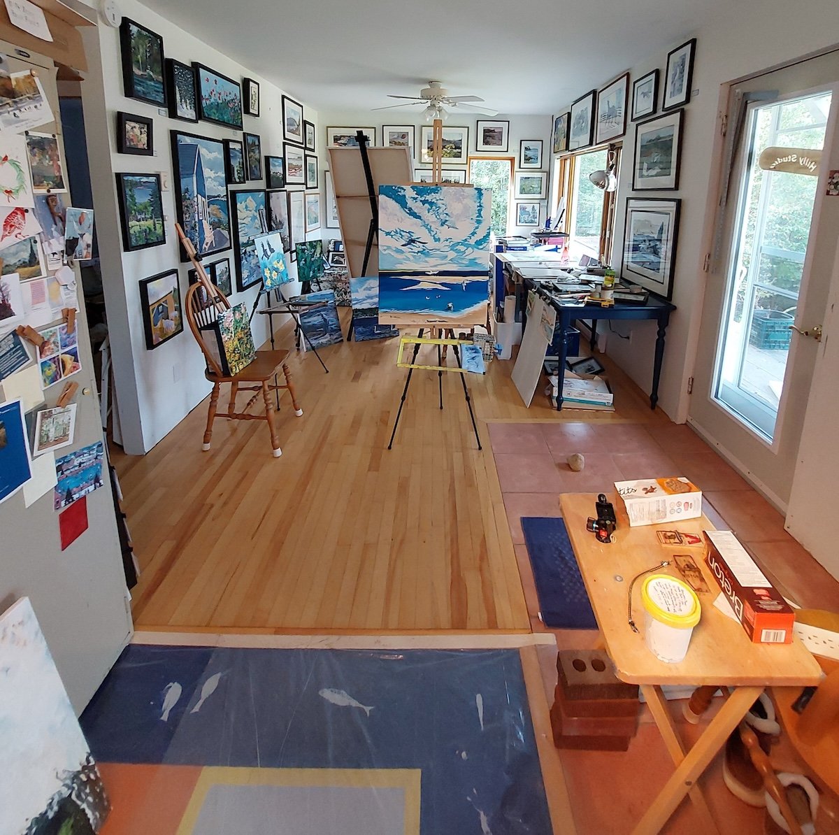 About ten years ago, Hill decided to concentrate on art full-time. From her Hilly Studio/Gallery in Mascarene, St. George, NB, she produces joyful works featuring eastern Canadian shores, landscapes, boats, people, flowers, and animals. She embraces the challenge of working in various media, including oils, watercolors, and handmade prints, and has recently been experimenting with larger canvas sizes, up to five feet tall.